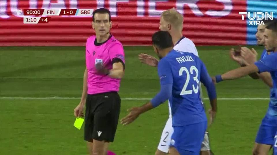 Tarjeta amarilla. El árbitro amonesta a Vangelis Pavlidis de Greece on September 5, 2019