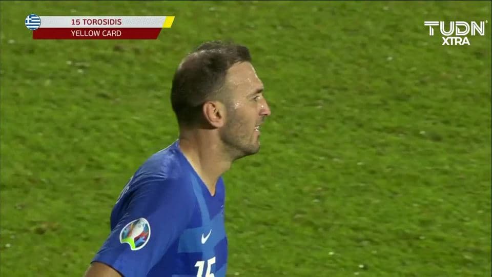 Tarjeta amarilla. El árbitro amonesta a Vasilis Torosidis de Greece on September 5, 2019
