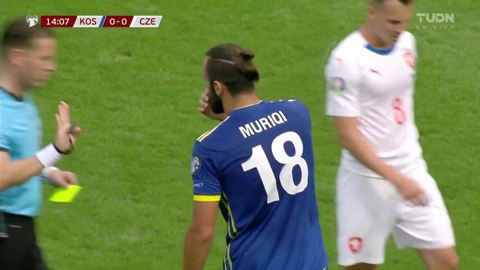 Tarjeta amarilla. El árbitro amonesta a Vedat Muriqi de Kosovo