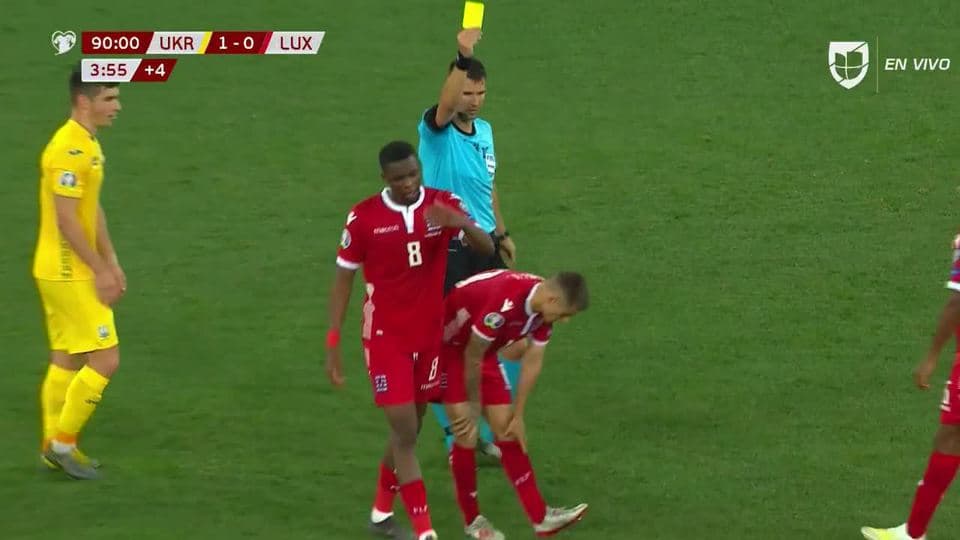 Tarjeta amarilla. El árbitro amonesta a Vincent Thill de Luxembourg
