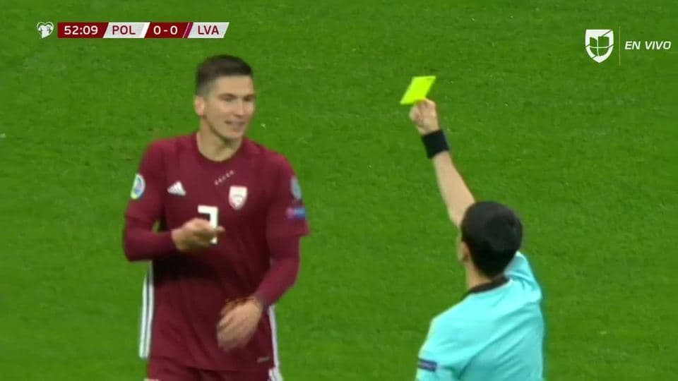 Tarjeta amarilla. El árbitro amonesta a Vitalijs Maksimenko de Latvia