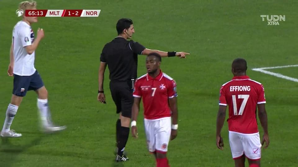 Tarjeta amarilla. El árbitro amonesta a Zach Muscat de Malta