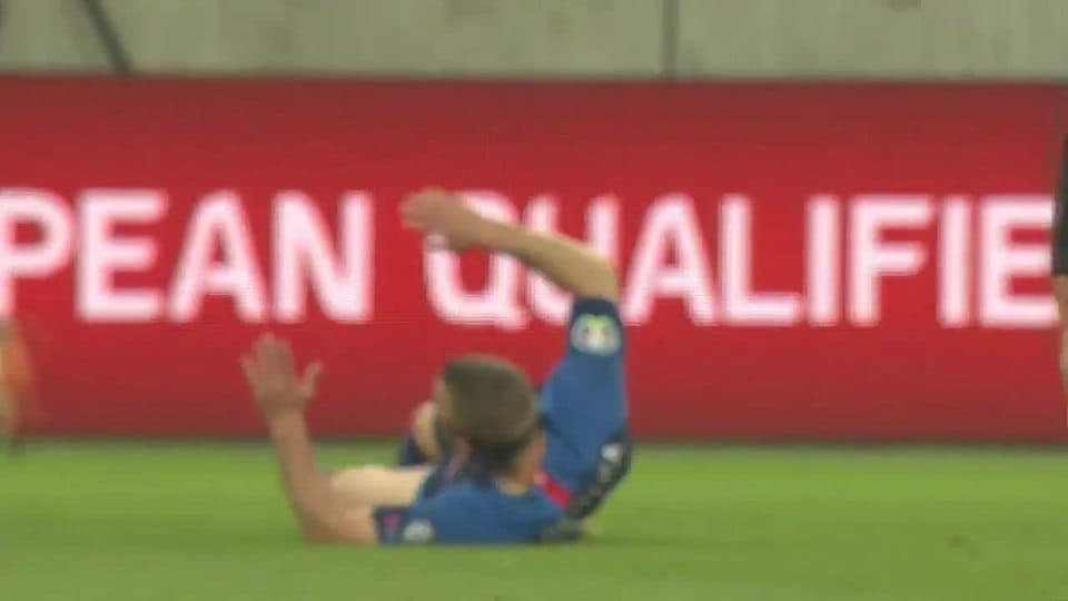 Tarjeta amarilla. El árbitro amonesta a Zsolt Kalmar de Hungary on March 21, 2019