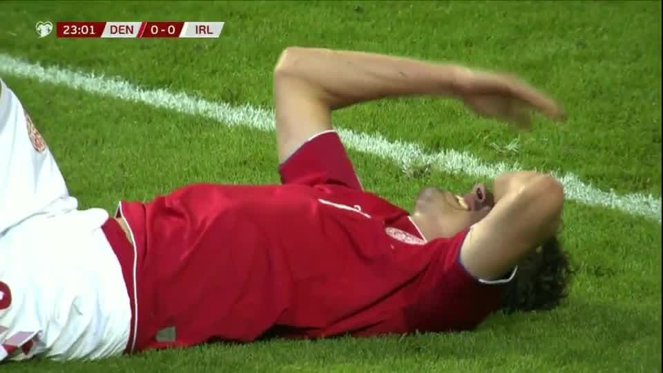 El mediocampista danés del Dortmund se lanzó de cabeza ante la marca de un defensa irlandés que alcanzó a golpearlo.