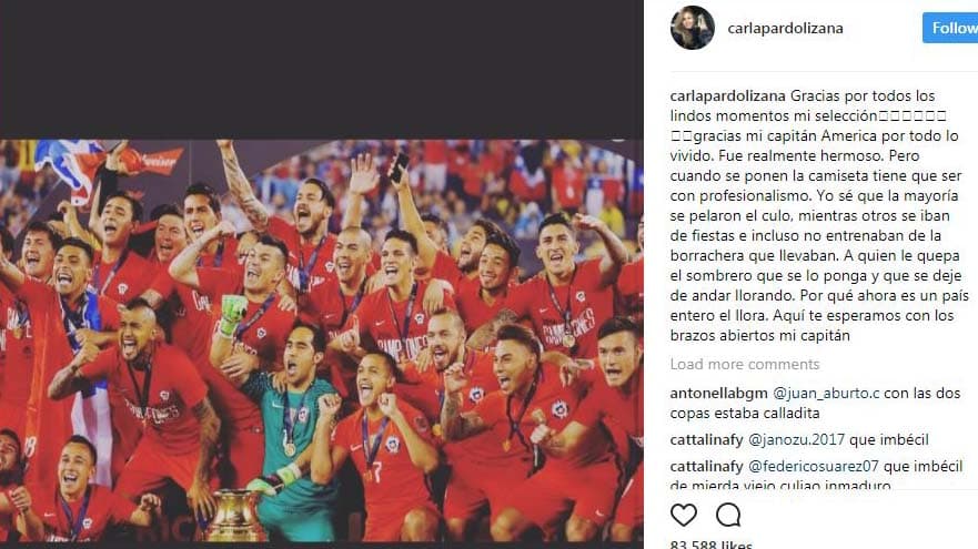Todo comenzó cuando la esposa del portero escribió en las redes sociales que a los jugadores chilenos les gustaba irse de fiesta y que eran unos borrachos. Claro que la buena de Carla Pardo Lizana dejó fuera de los ‘fiesteros’ a su amado esposo.