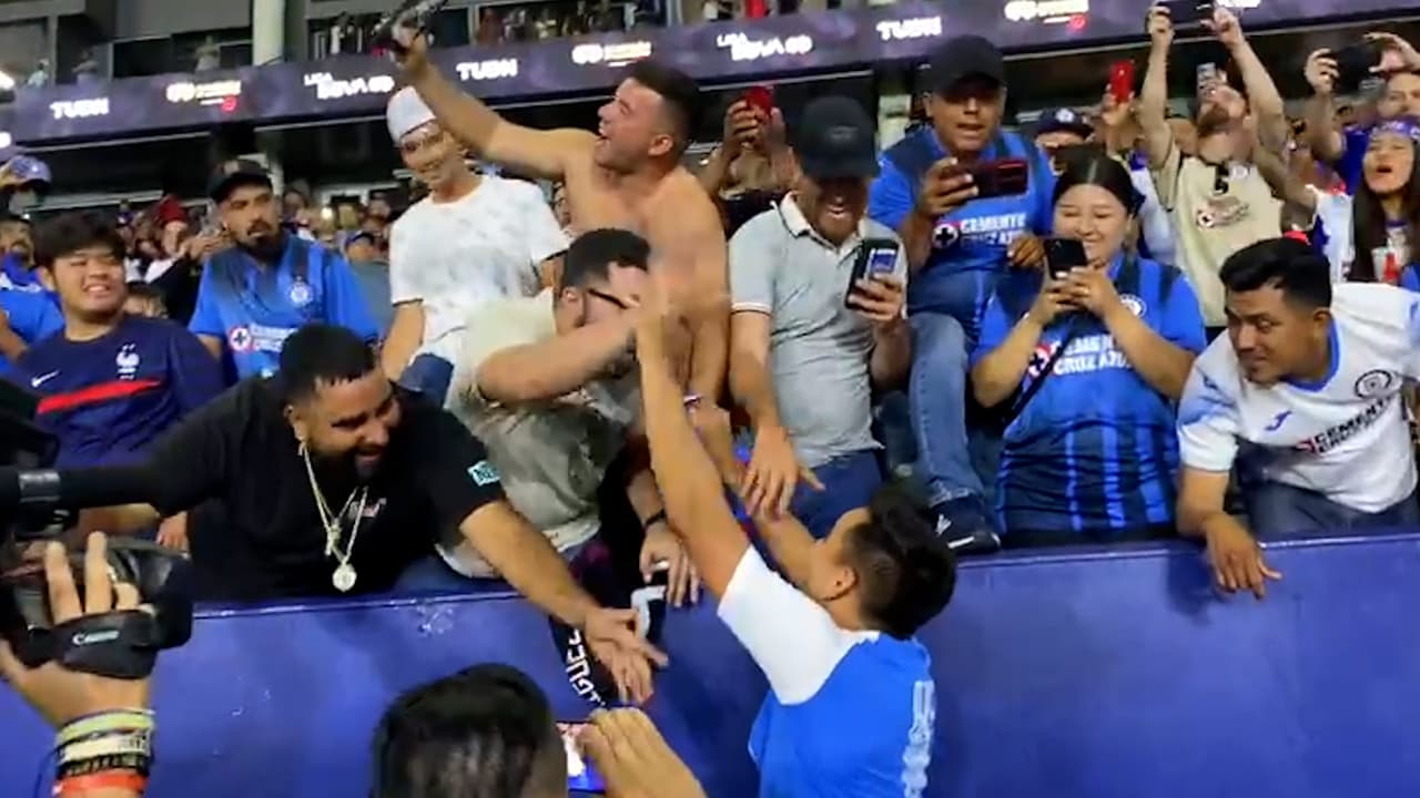 El volante de Cruz Azul tuvo que pedir una playera prestada, pero luego se la devolvió al aficionado que le hizo el favor.