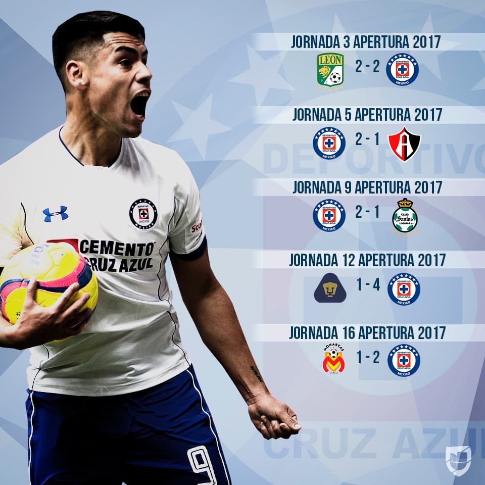 Fueron ocho goles los que marcó en su primer torneo y ya lleva cuatro en este Clausura 2018 y en todos Cruz Azul ha sumado, por lo menos un empate, que bien le ha válido para meterse en la Liguilla pasada y también revivir el sábado pasado cuando golearon al pachuca.