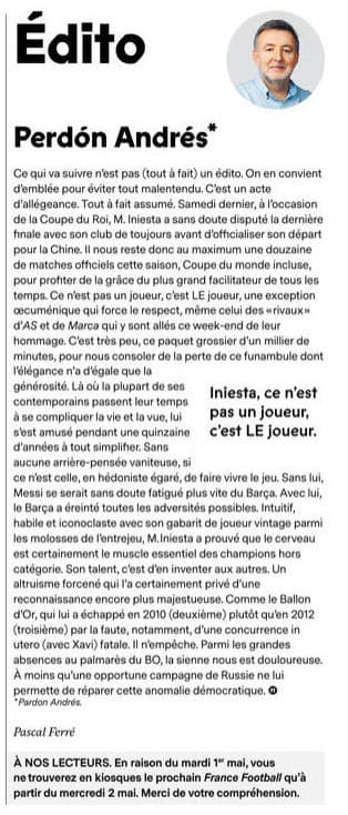 La revista francesa France Football le pidió disculpas al español Andrés Iniesta en su última edición por no haberle galardonado con un Balón de Oro durante todos estos años.