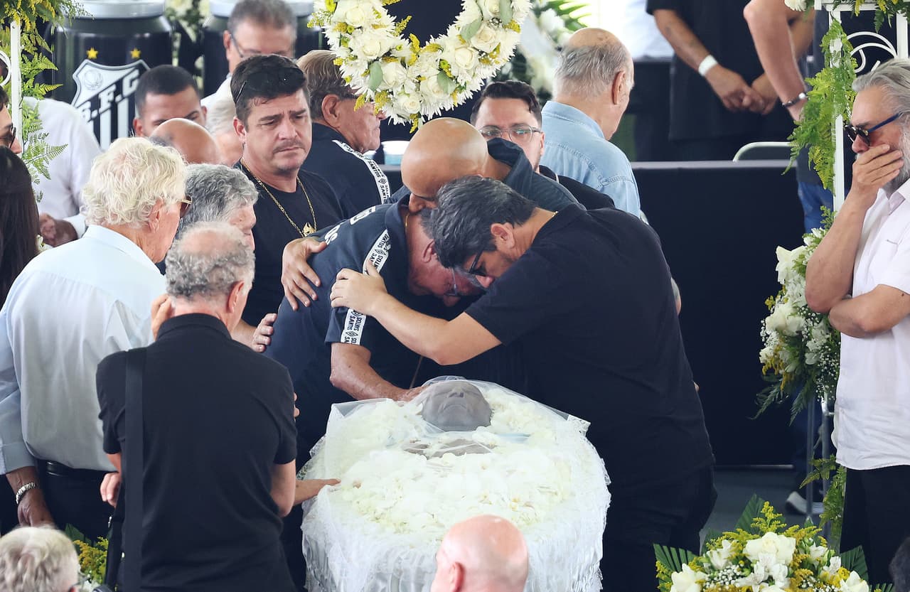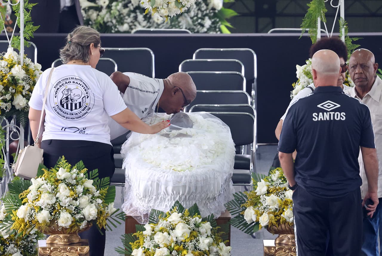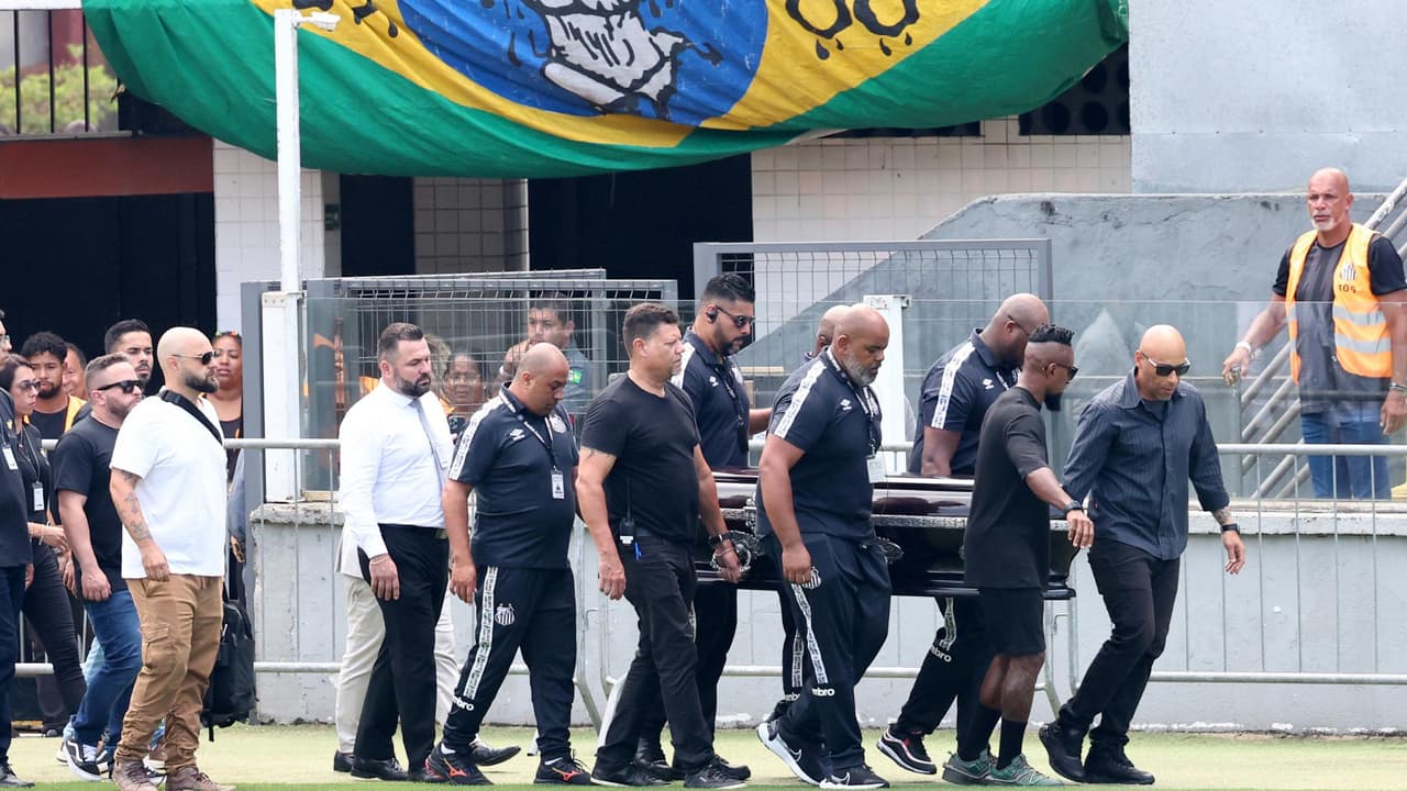 Edinho, hijo de Pelé, y el exjugador Zé Roberto cargaron el ataúd, ayudados por personal del Santos, hasta una carpa situada en el centro de la cancha, un espacio que está reservado para los familiares.