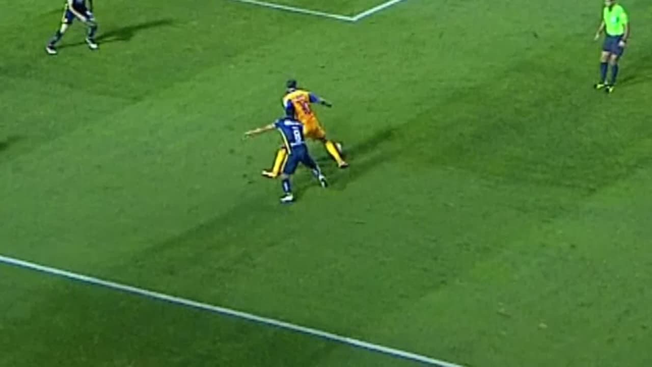 El delantero de Tigres da un giro con el balón y se quita al “Rifle” de gran manera.