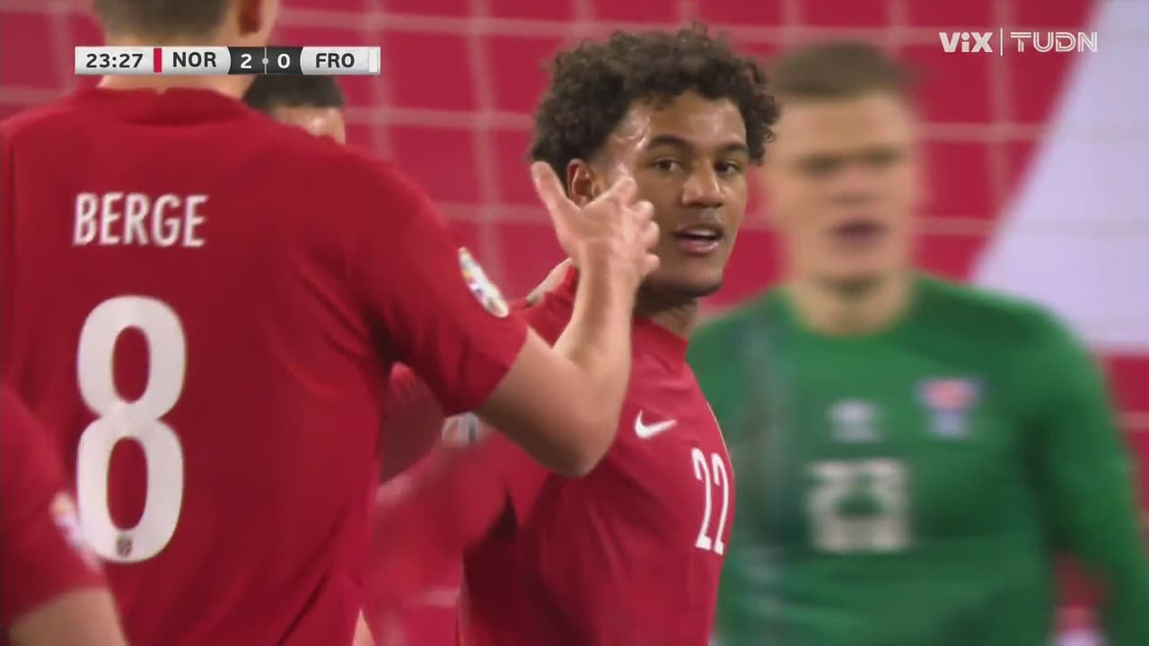 El jugador del Manchester City toma el balón en los linieros del área y con un hermoso derechazo, marca el segundo para Noruega.