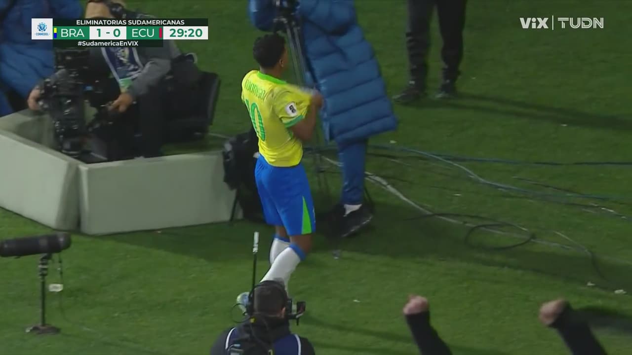 El número 10 de Brasil se acomoda el esférico y dispara al arco de Ecuador, pero en la trayectoria lo desvía Pacho para que se concrete el 1-0 de los amazónicos.