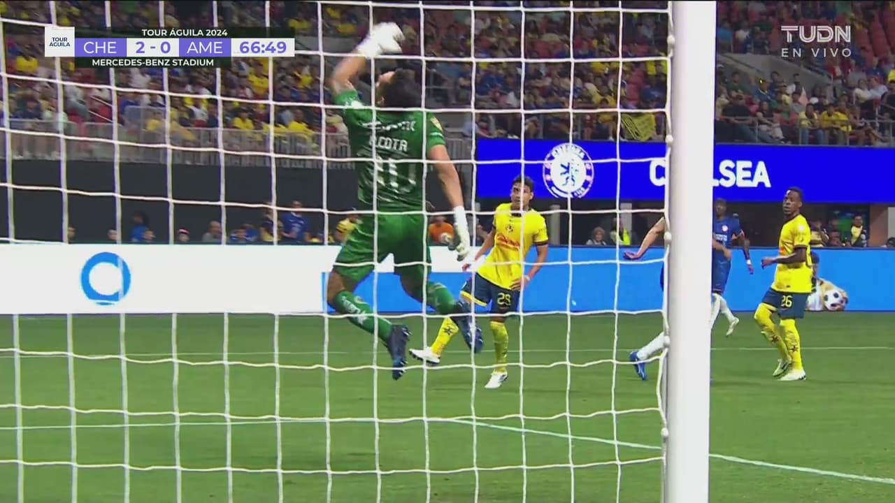 El ofensivo del Chelsea metió un tiro de media vuelta que tocó en un defensor azulcrema y aún así Rodolfo la tapó bien.