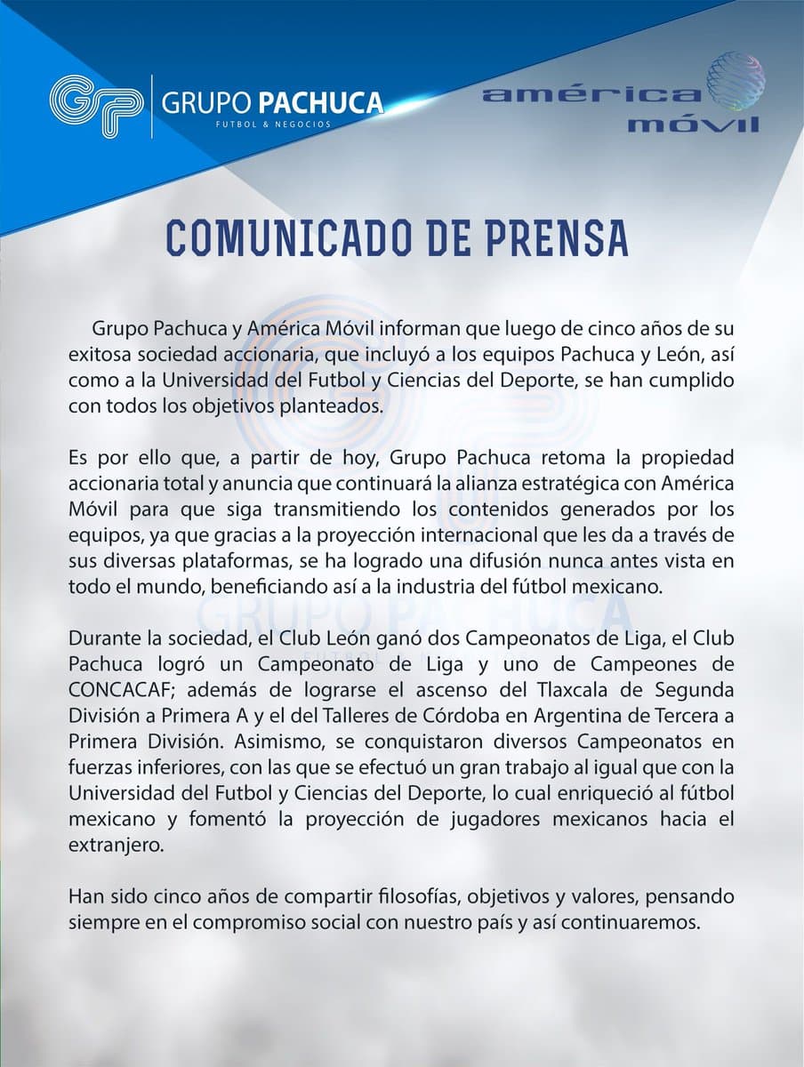 "A partir de hoy, Grupo Pachuca retoma la propiedad accionaria total y anuncia que continuará la alianza estratégica con América Móvil para que siga transmitiendo los contenidos generados por los equipos, ya que gracias a la proyección internacional que les da a través de sus diversas plataformas"
