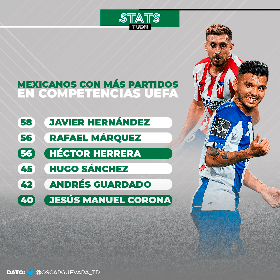 Con el cotejo de este martes, Héctor Herrera llegó a 56 partidos disputados en competiciones de la UEFA y alcanzó a otro histórico mexicano, Rafael Márquez, quien lo hiciera con AS Mónaco y FC Barcelona.