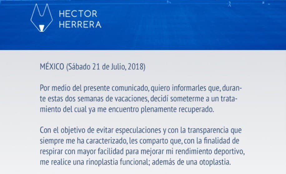Héctor Herrera se opera la nariz por "rendimiento deportivo", no por estética