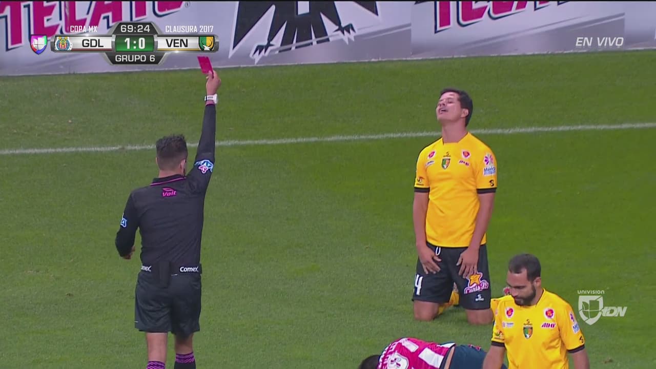 El defensa de Venados cometió una terrible infracción sobre Michelle Benítez, que el árbitro sancionó con roja directa.