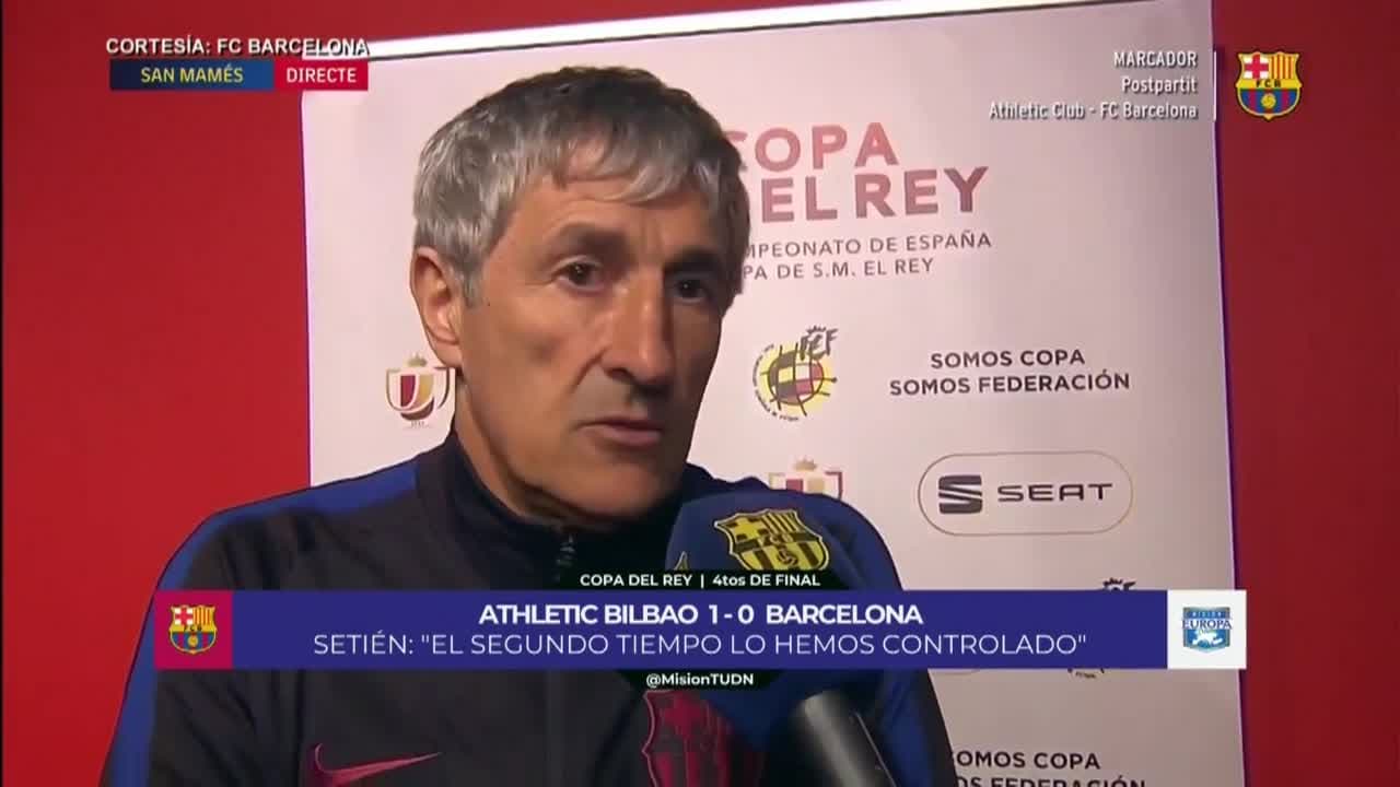 Quique Setién, entrenador azulgrana, se mostró feliz por el funcionamiento del equipo pese a la derrota y lamentó que el Athletic haya anotado en la recta final del encuentro.