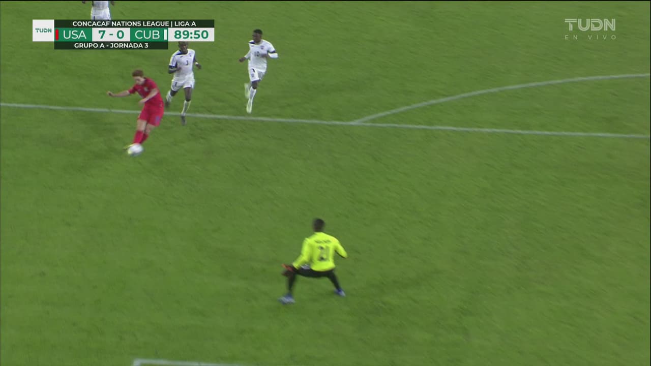 El delantero estadounidense roba el balón en el medio campo, se mete al área para quedar solo frente al portero de Cuba y vuela su disparo al 90’.