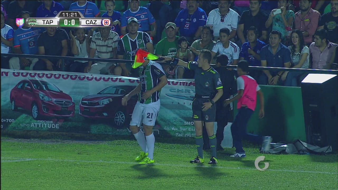 Cuando se jugaba los primeros minutos del partido, el árbitro asistente golpe sin querer al jugador de Cafetaleros al marcar un saque de banda para su equipo.