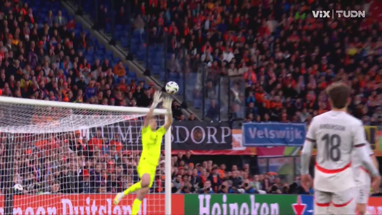 El atacante de Holanda desbordó por la izquierda y metió un tiro con efecto que sacó el arquero con apuros.