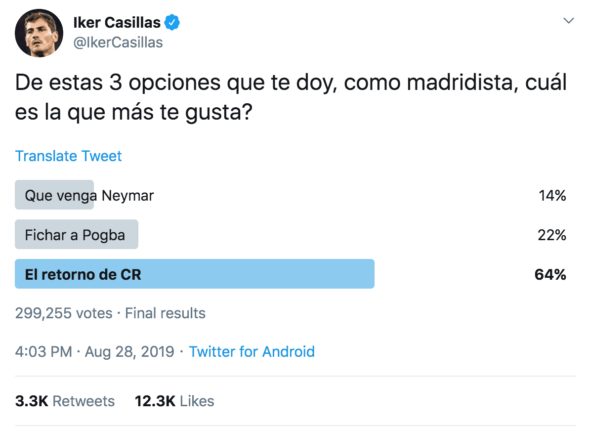 Y la tercera es una opción que parece imposible, pero es, sin duda, la preferida por los aficionados del club blanco. Casillas propone el regreso de Cristiano Ronaldo, opción que gana con claridad en la encuesta, ya que un 64% de los votantes quiere de vuelta a CR7 en el Bernabéu, superando el 22% del francés y el 14% del brasileño.