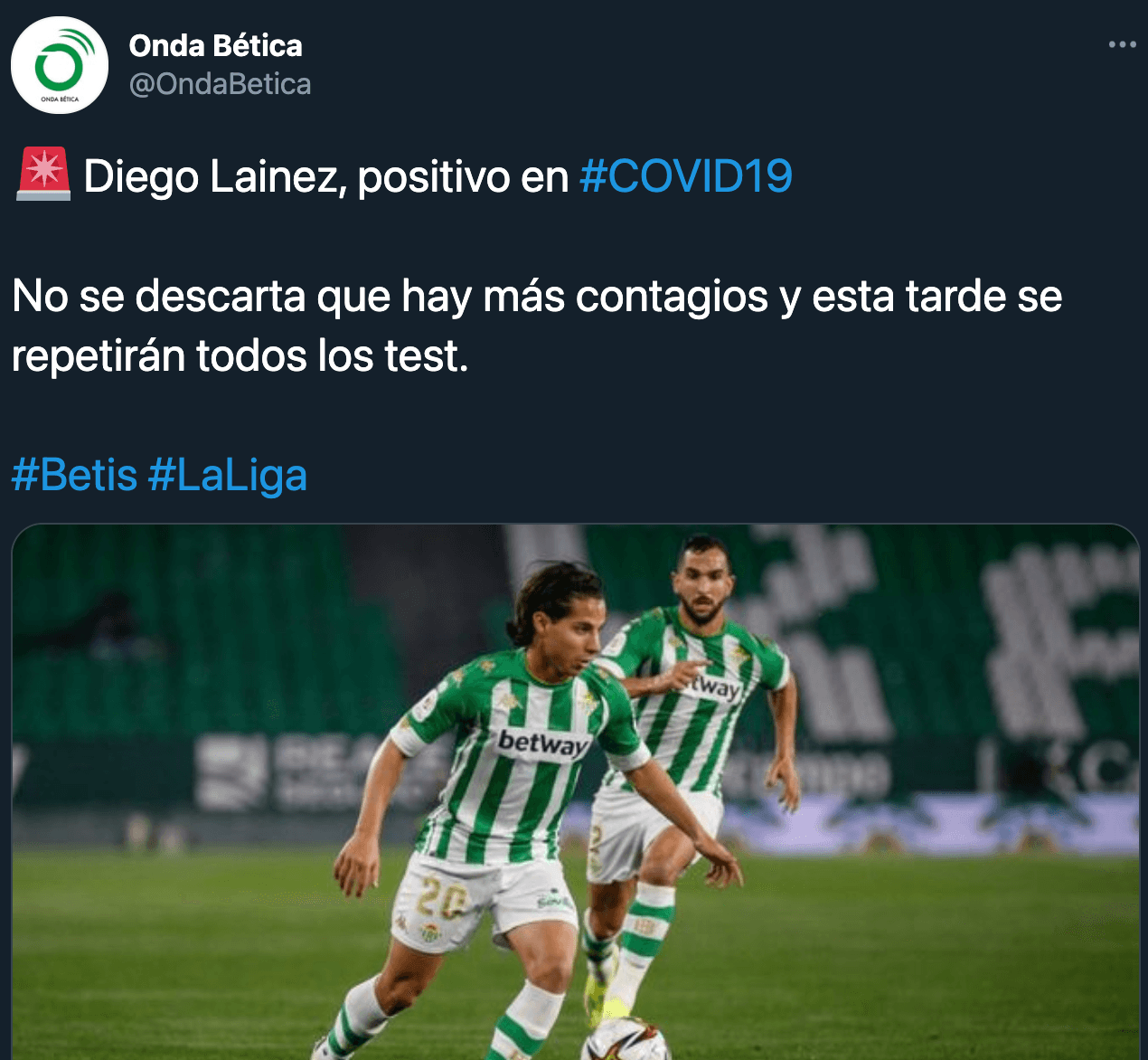 Diego Lainez, futbolista del Real Betis, estaría contagiado por COVID-19 si bien su equipo no se ha pronunciado oficialmente, tampoco el jugador. Hay incertidumbre ya que se señala un potencial resultado no concluyente.