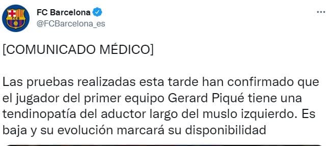 El jugador del Barcelona Gerard Piqué padece una tendinopatía del aductor largo del muslo izquierdo, según las pruebas médicas a las que fue sometido este viernes.