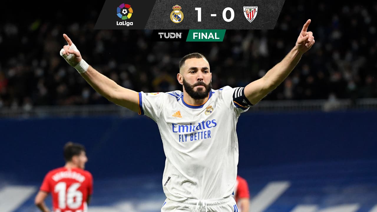 El Real Madrid firmó su quinto triunfo liguero consecutivo, sin brillantez pero con eficacia, con un solitario gol de Benzema a los 40 minutos al aprovechar el rechace de Unai Simón a un disparo de Marco Asensio y el intento fallido de disparo de Luka Modric que convirtió en asistencia de gol. El delantero francés convirtió al Athletic Club en el equipo al que más goles ha marcado en su carrera con su decimoquinto gol.