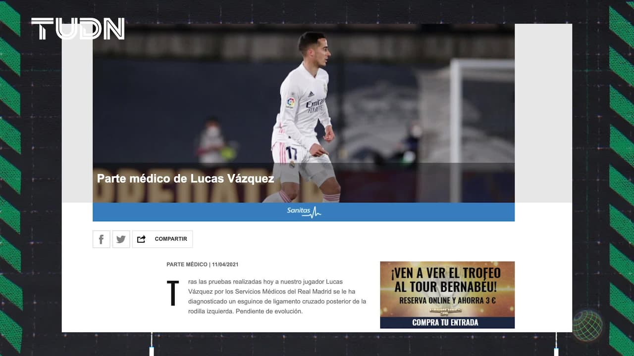 Hay malas noticias en el Real Madrid porque Lucas Vázquez tiene una lesión en la rodilla que lo deja fuera de acción ocho semanas, las mismas que le quedan a la actual temporada de LaLiga de España. Fede Valverde también es seria duda para jugar la Champions League ante el Liverpool.