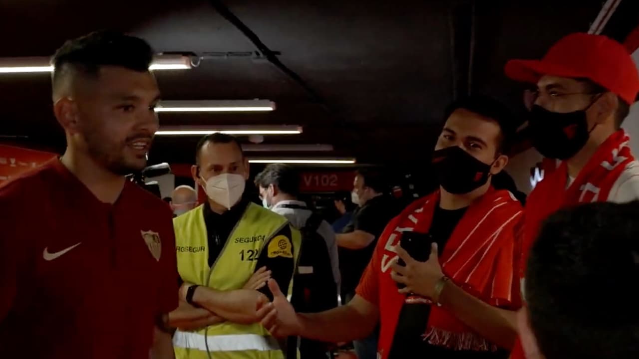 ‘Tecatito’ Corona despedazó a la defensa del Real Madrid y asistió para el gol de Lamela, por eso la afición sevillista lo reconoció y al final del encuentro fue felicitado por algunos fans que estaban en los pasillos del estadio.