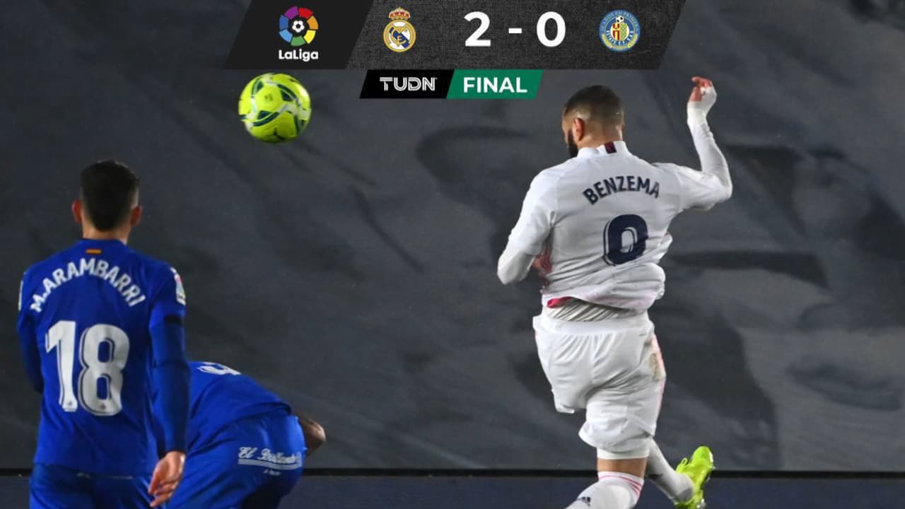Real Madrid logró destrabar la defensiva del Getafe y con goles de Karim Benzema y Ferland Mendy descontaron puntos al Atlético de Madrid, mientras dejan a Barcelona en tercer lugar con tres unidades menos.