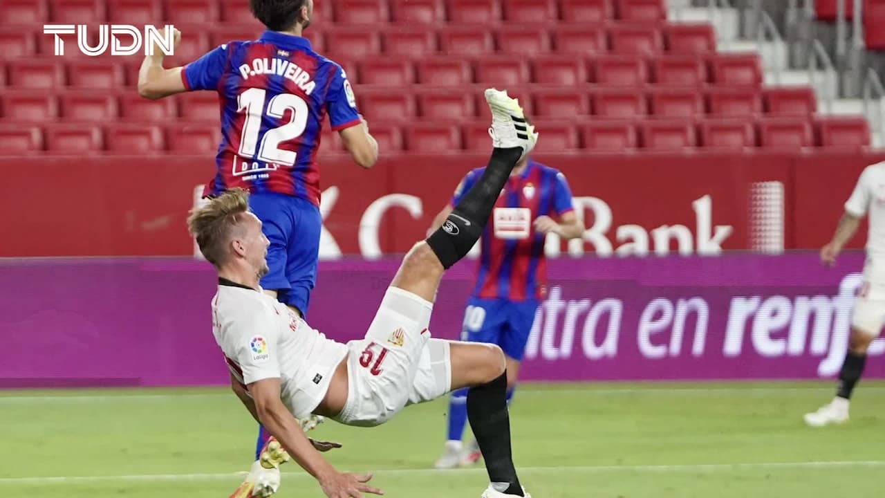 La jugada concluyó en tiro de esquina, al cobro fue Dmitrovic para rematar un balón de primera que terminó rechazando, apenas, Lucas Ocampos quien se puso de portero tras la lesión de Tomas Vaclik, en una serie de rebotes que casi le dan el empate al Eibar, pero Jesús Navas despejó como pudo un balón en la línea cerca del segundo poste. Ahí pitó el final Mateu Lahoz, para fortuna del cuadro sevillano.