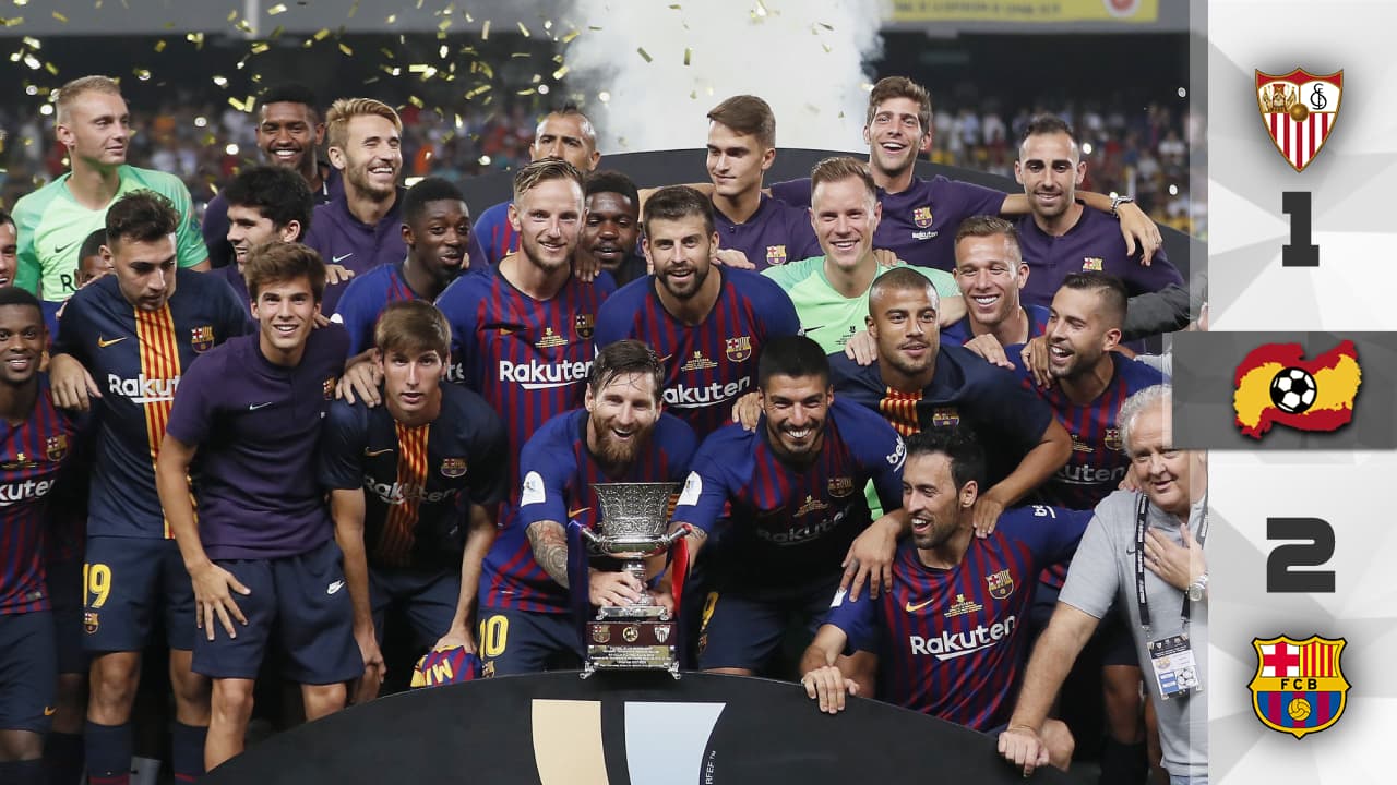 Barcelona ganó la Supercopa de España luego de remontar 2-1 al Sevilla en la final que se llevó a cabo en el Estadio de Tánger este domingo, lo que significó la décimatercera ocasión que levanta dicho trofeo.