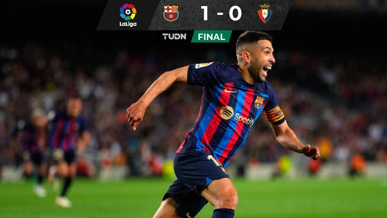 El Barcelona se impuso por 1-0 al Osasuna con un gol de Jordi Alba con un disparo dentro del área en el minuto 85 y se acerca aún más al título de Liga al sacarle 14 puntos al Real Madrid, que más tarde enfrenta a la Real Sociedad, tras un partido marcado por la expulsión con roja directa de Jorge Herrando en el minuto 27.