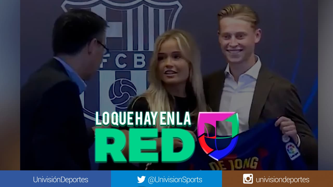 Durante la presentación de Frenkie de Jong, el presidente del Barcelona le saca la cartera a la novia del holandés para que pose mejor en las fotos. Muy atento a todo… o desesperado por recolectar fondos.