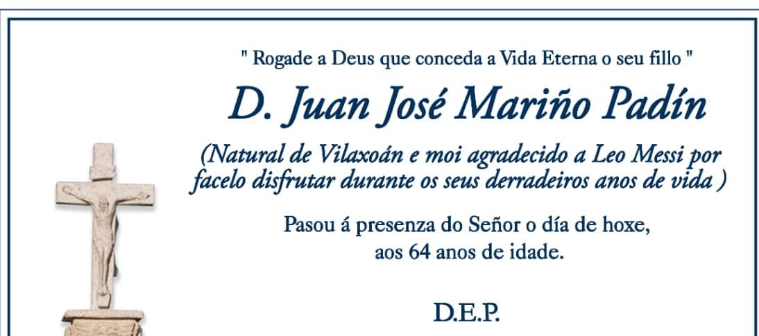 "Natural de Vilaxoán y muy agradecido a Leo Messi por hacerlo disfrutar durante sus últimos años de vida", dice la esquela, en clara referencia al crack argentino del Barcelona, quien ha ocupado infinidad de páginas en los periódicos, pero nunca por un motivo como este.