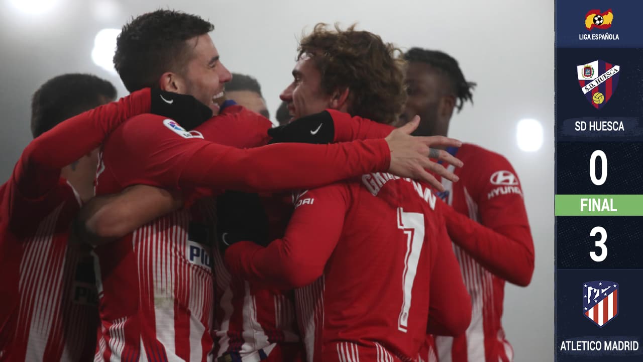 Son tres puntos para la escuadra de Diego Simeone, que suma 41 por 43 del FC Barcelona que aún debe jugar. El Huesca va camino del descenso.