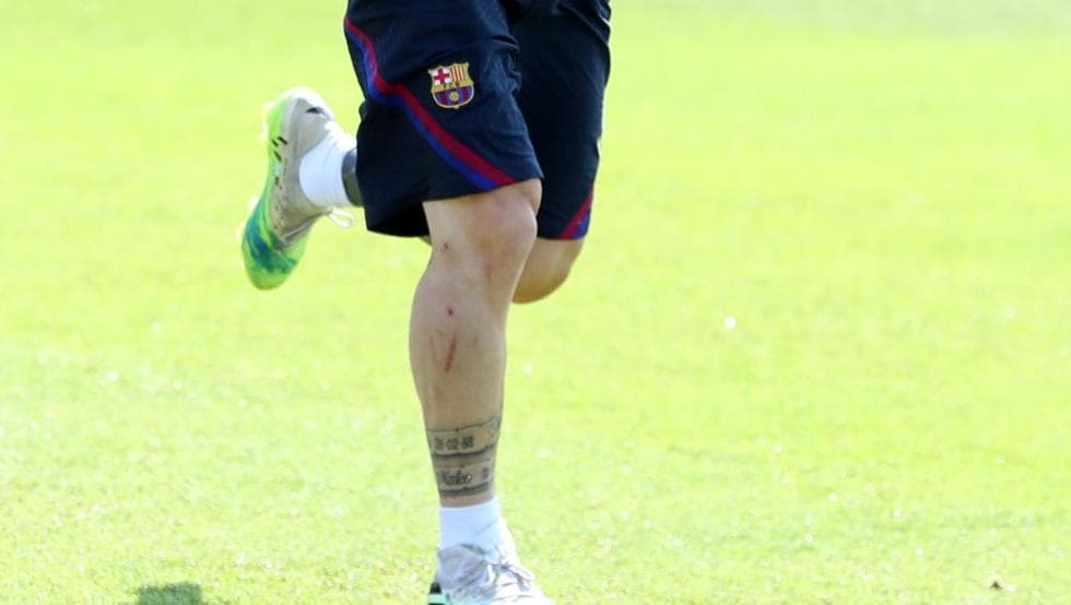 En la práctica del equipo culé este domingo llamaron la atención las huellas que dos días después de la entrada de Diego Carlos aún pueden verse con claridad en la pierna izquierda de Messi.