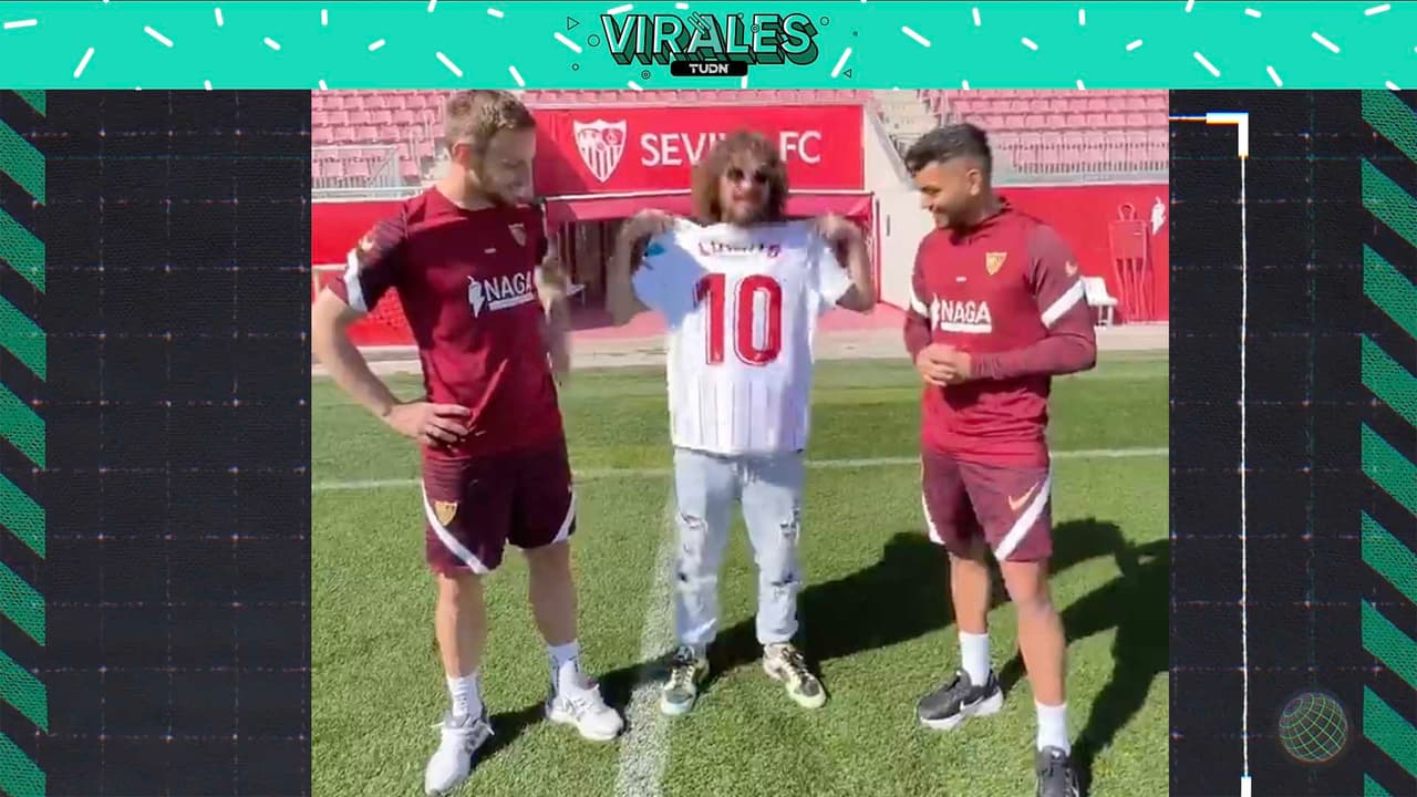 El youtuber mexicano visitó al equipo sevillano en el Ramón Sánchez-Pizjuán para convivir y dominar el balón con su compatriota.