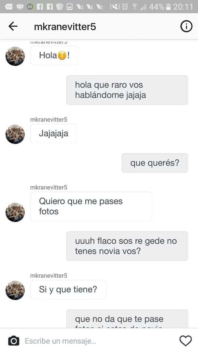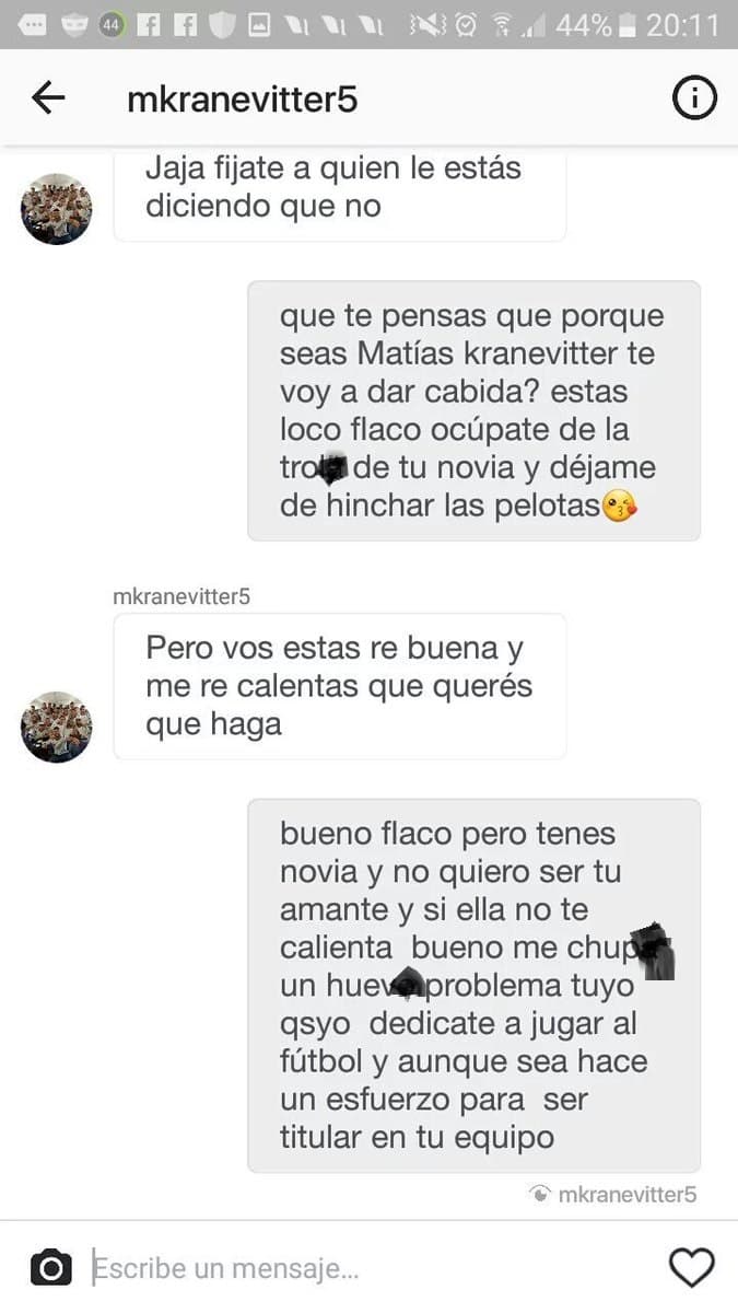 La cuenta de Twitter @anti_boti publicó en Twitter la supuesta conversación, en la que se lee: "¿Que te pensás que porque seas Matías Kranevitter te doy a dar cabida? Estás loco, flaco. Ocúpate de la tr... de tu novia y déjame de hinchar las pelotas".