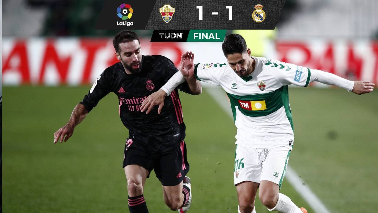 Real Madrid se alejó del liderato del Atlético de Madrid al cerrar el 2020 con un empate de 1-1 frente al Elche para terminar en el segundo lugar de LaLiga con 33 puntos.