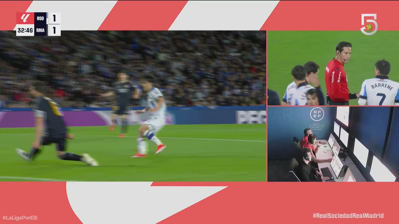 La jugada más polémica en lo que va del partido en la Reale Arena. El VAR hizo notar a final de cuentas la falta sobre Tchouaméni.