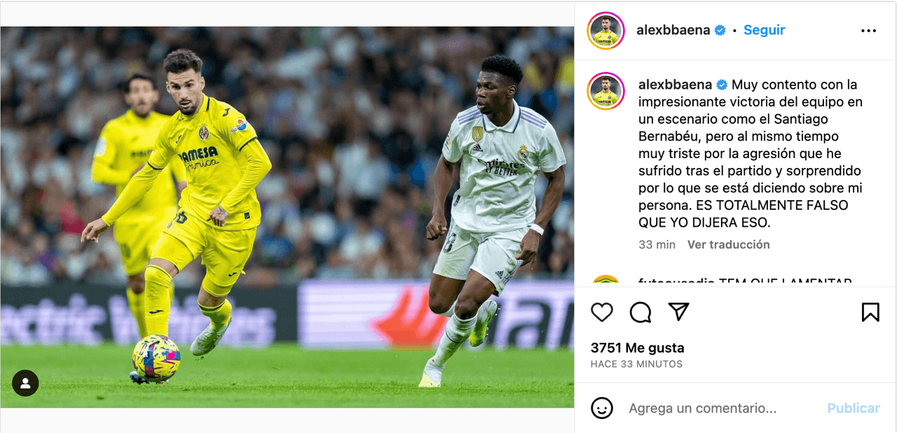 "Muy contento con la impresionante victoria del equipo en un escenario como el Santiago Bernabéu, pero al mismo tiempo muy triste por la agresión que he sufrido tras el partido y sorprendido por lo que se está diciendo sobre mi persona. ES TOTALMENTE FALSO QUE YO DIJERA ESO", publicó el jugador del Villarreal en su cuenta personal de Instagram.