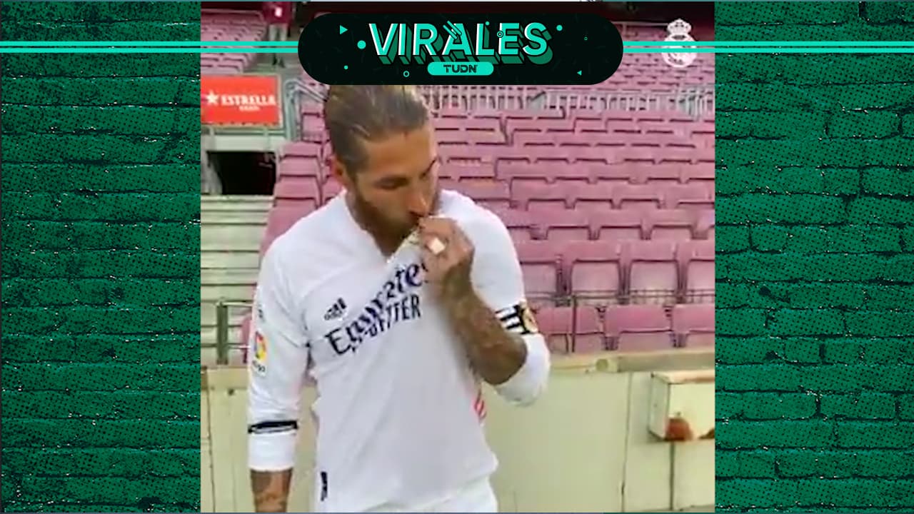 Sergio Ramos besa el escudo del Real Madrid en el Camp Nou