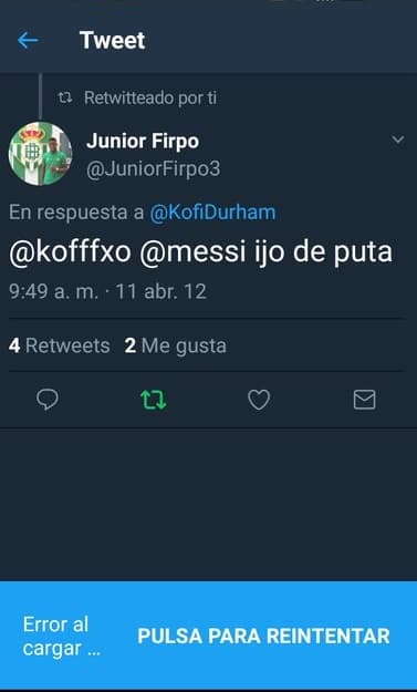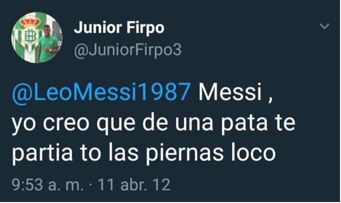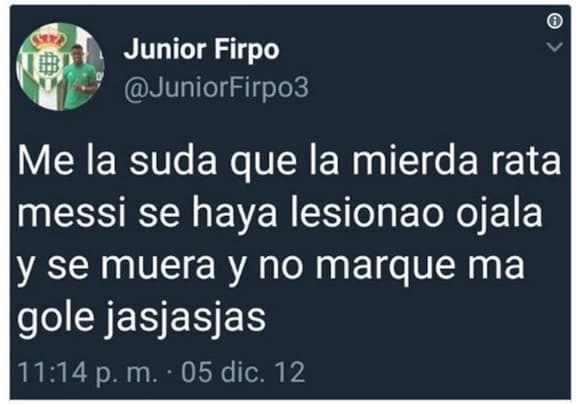 Sin embargo, la nota fue que, en el año 2012, Firpo publicó una serie de tuits polémicos deseándole la muerte a Lionel Messi y pidiendo “lesionarlo para que ya no marque más goles.” El jugador aún no pertenecía a ningún equipo de La Liga, pues llegó al Betis en 2015.
