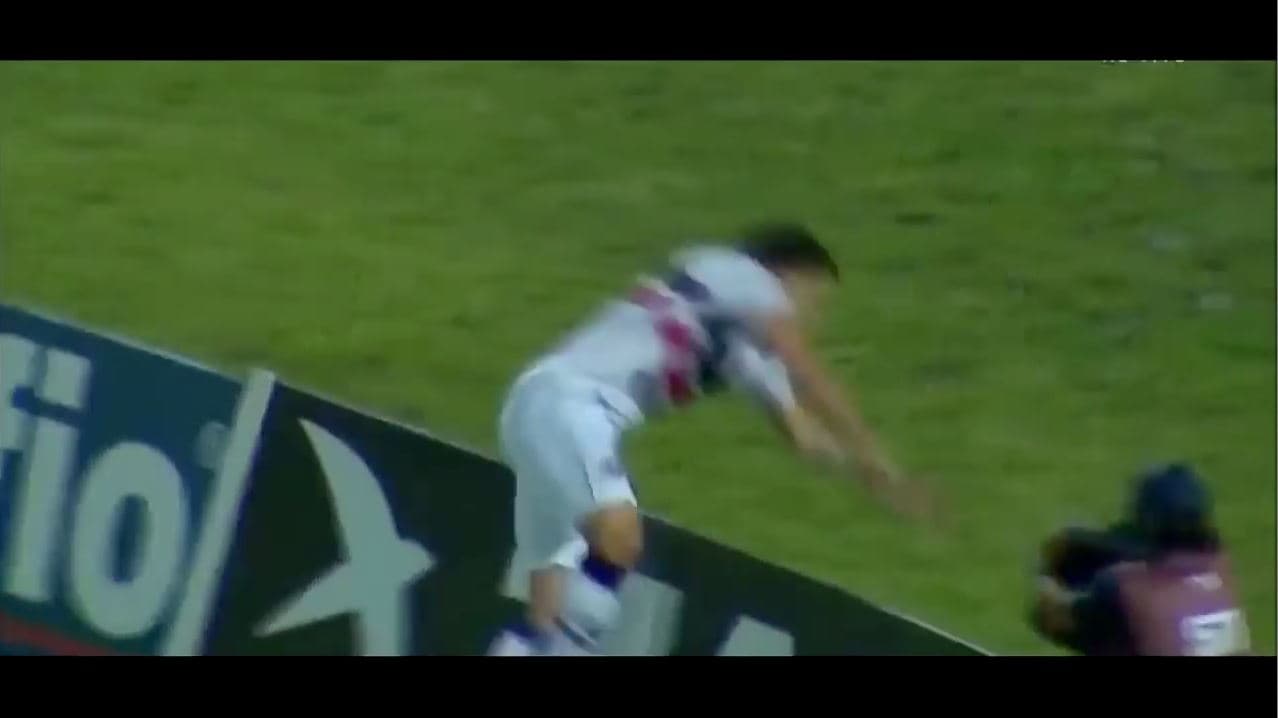 Le sucedió al jugador André Luis, del equipo brasileño Santa Cruz, quien intentaba celebrar su gol con la grada, pero no saltó bien la publicidad y se pegó un fuerte golpe.