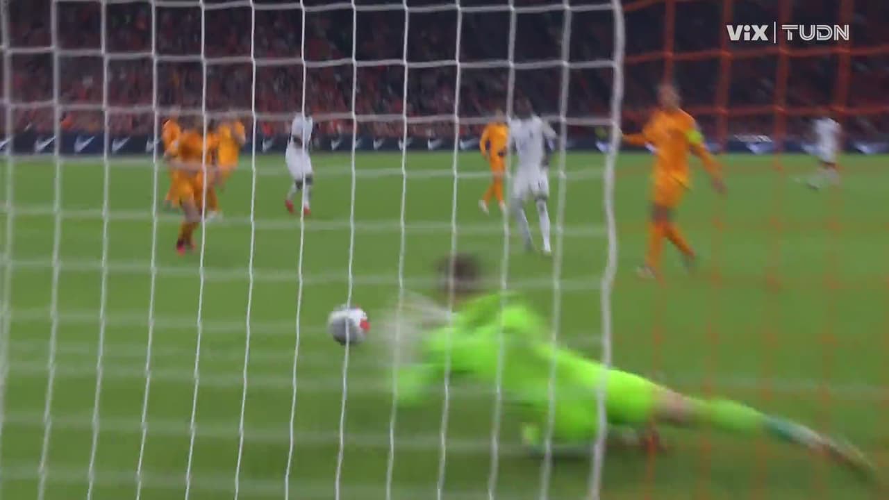 Aurélien prueba una de sus mejores armas que es el tiro de lejos, pero Verbruggen está muy atento al disparo.