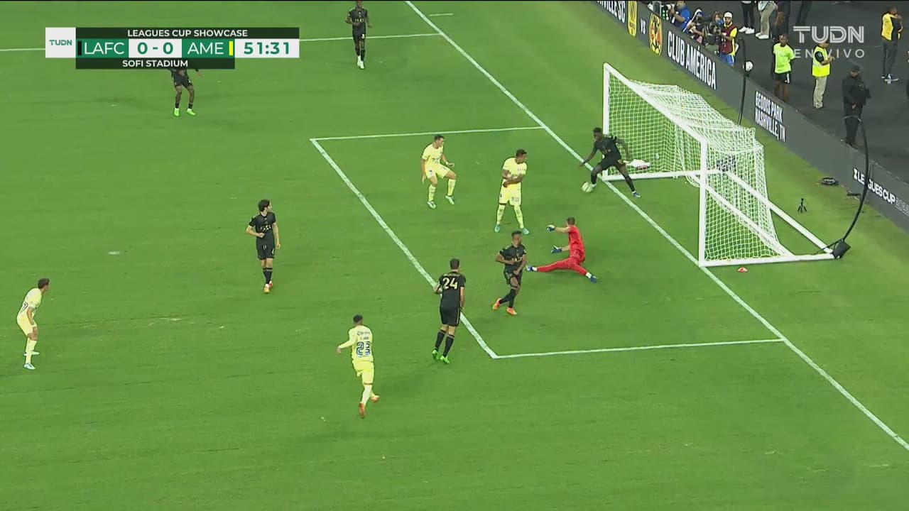 El jugador de América se tiene la confianza, saca el zapatazo y el central la tiene que sacar.