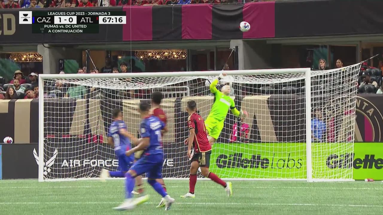 El atacante de Cruz Azul se acomoda el balón y de zurda intenta sobre la portería del United. Se queda en aproximación.